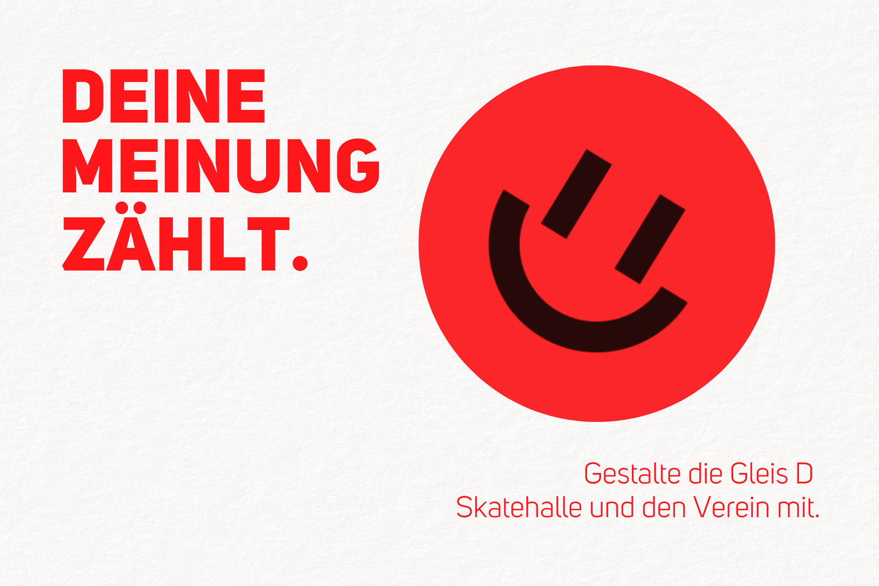 Wir möchten gemeinsam mit euch entscheiden, wie Gleis D sich in den nächsten Jahren entwickeln soll. Deshalb starten wir eine Umfrage, die uns hilft, ein ehrliches Bild davon zu bekommen, was euch wichtig ist und was Gleis D aus eurer Sicht ausmacht.